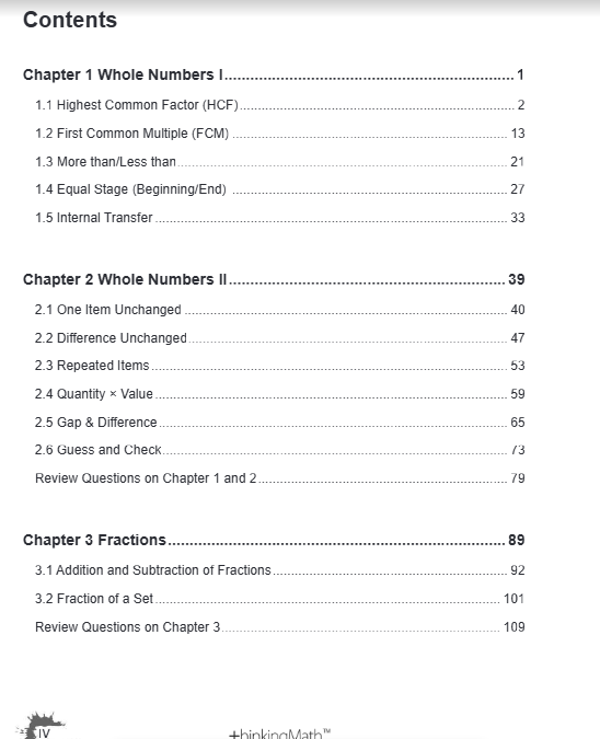 Complementing school resources, +hinkingMath workbook contents are sorted according to topics (e.g. Whole Numbers, Time, Fractions)